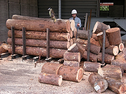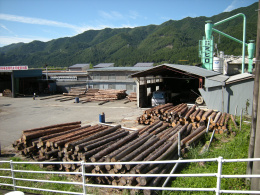 弊社における木毛セメント板の製造工程をご説明いたします。| ■山林から集材されたひのき/杉などの間伐材・林地残材は、弊社の貯木場に集められます。 | ||