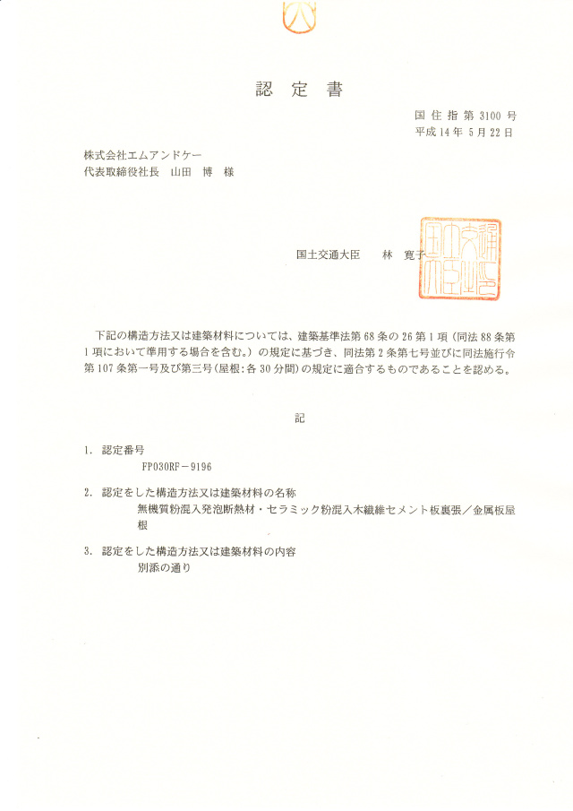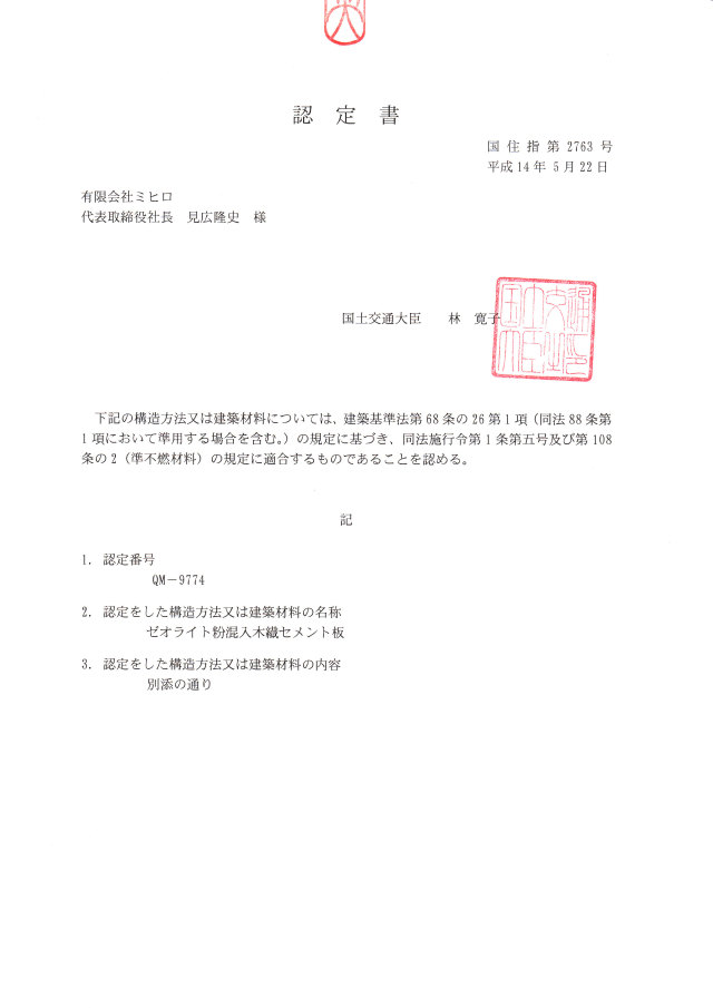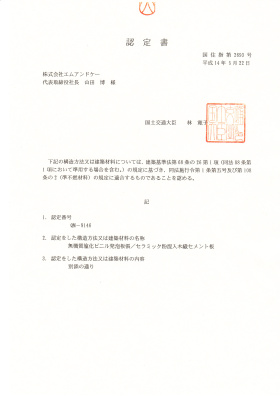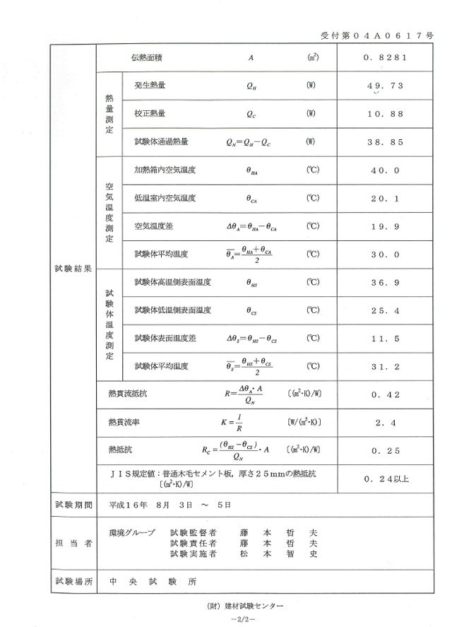 | 準不燃材料を定める認定書 | 試験成績表(熱貫流抵抗・熱貫流率・熱抵抗) |