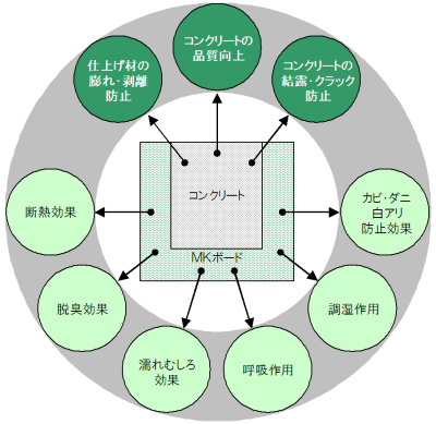 高温多湿で季節の変化が顕著な日本の気候では、建築物の室害・・・結露、カビ、腐食・・・がしばしば問題となります。とりわけコンクリート建築物は、多量の水分を含むため、対策を怠ると後々までトラブルの原因となります。呼吸作用のある木繊維と木の3倍もの調湿機能をもつ細多孔質セラミック粉末を含むMKボードは、コンクリートの水分を適切に排出し、結露やクラックを起こさない適度な乾燥度に仕上げ、建物の耐久性を高めます。 |