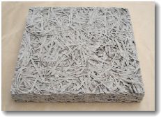 木質系セメント板は木材(間伐材、建築古材、製材残材等)を切削し、セメントと混練圧縮成型したボードです。